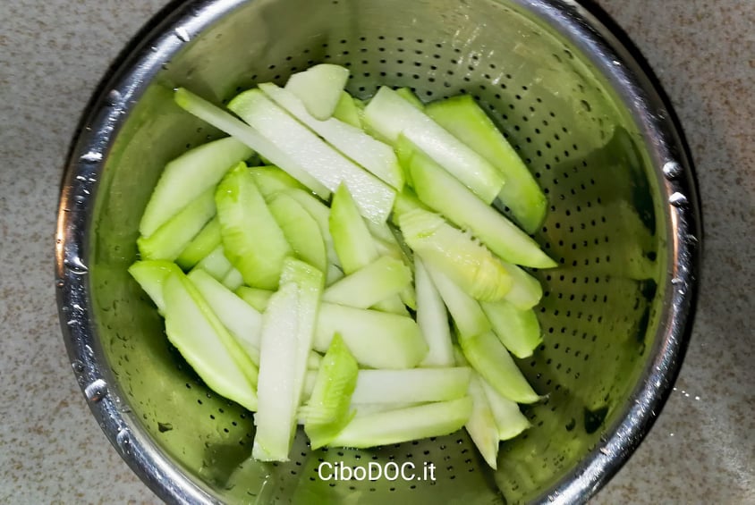 Se l’ortaggio è piccolo tagliatelo a fettine di mezzo centimetro e poi a listarelle non troppo sottili. Se è un po’ più grosso potete tagliarlo a cubetti.