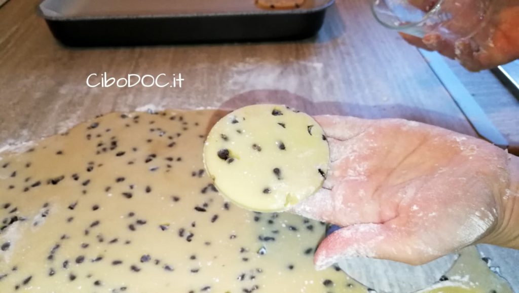 Una volta steso l’impasto date forma ai biscotti usando un coppapasta o un bicchiere, poi disponeteli su una teglia coperta da carta.