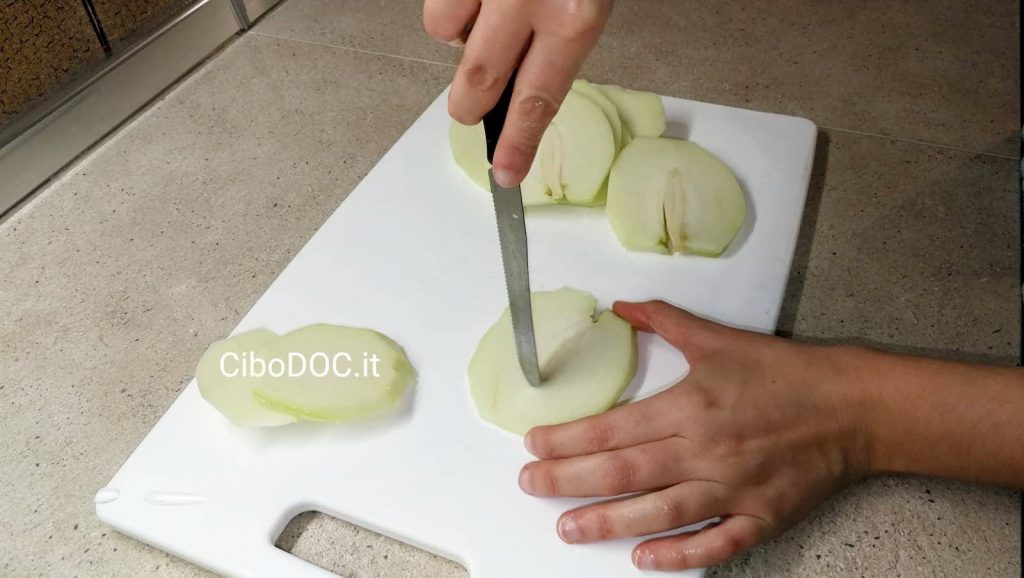 Iniziate la preparazione sbucciando le zucchine. Questa operazione preliminare potrebbe risultare antipatica per via delle spine e del liquido viscoso che rende i frutti scivolosi. Indossate dei guanti da cucina per rendere tutto più facile. Tagliate le zucchine per ottenere delle fette spesse circa 1 centimetro. Dalle fette centrali dovrete poi eliminare con la punta del coltello la porzione di seme che non è commestibile.